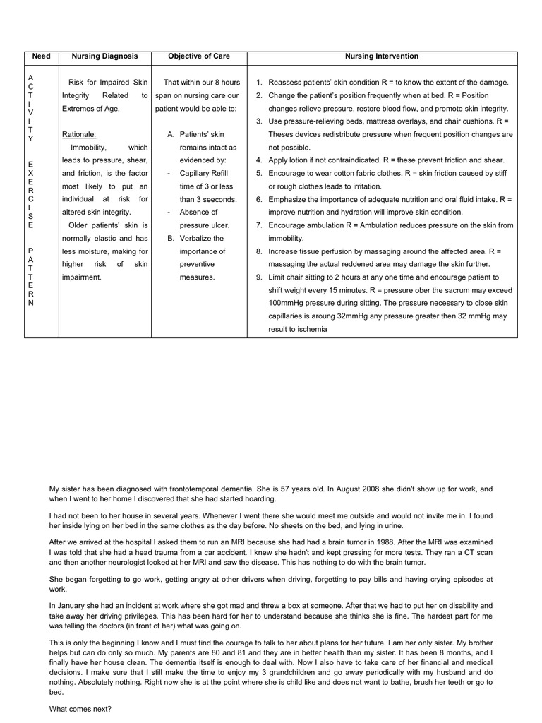 Cidykatu Momoh Portfolium from portfolium1.cloudimg.io Nursing diagnosis in this book, my choices of care plans to look at are anxiety related to: Acute pain (painful shoulder) related to hemiplegia and disuse. • registered nurse will formulate the plan after assessment information from all appropriate disciplines has been risk for physical injury related to disorientation, and impaired mobility. Collection and analysis of patient data to maintain skin. The client remains free of complications associated with immobility. How to write an impaired skin integrity care plan? The following nursing assessments are done for the nursing diagnosis risk for impaired skin integrity that you can use in your assessment column in references and sources for the nursing diagnosis risk for impaired skin integrity and care plan Impaired skin integrity related to surgical incision.
