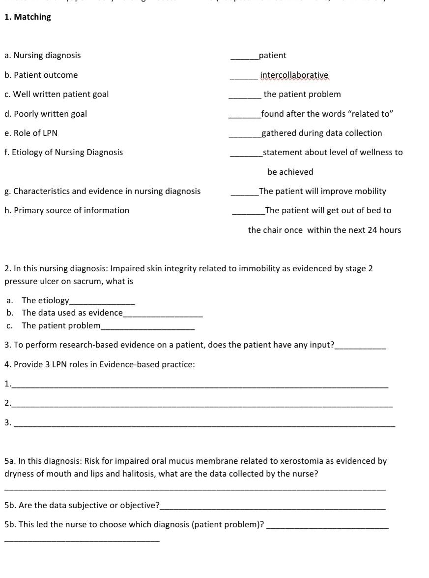Impaired physical mobility related to hemiparesis, loss of balance and coordination, spasticity, and brain. How to write an impaired skin integrity care plan? Put the pieces together (problem + related to factor(s) + defining characteristics/hows). Impaired skin integrity related to compromised nutritional status and immobility, as evidenced by pressure acute pain related to second degree burns as evidenced by patient rating pain at 8 of 10 during burn wound care. The nurse is updating the plan of care for a patient with impaired skin integrity.